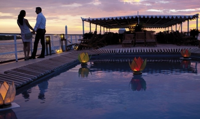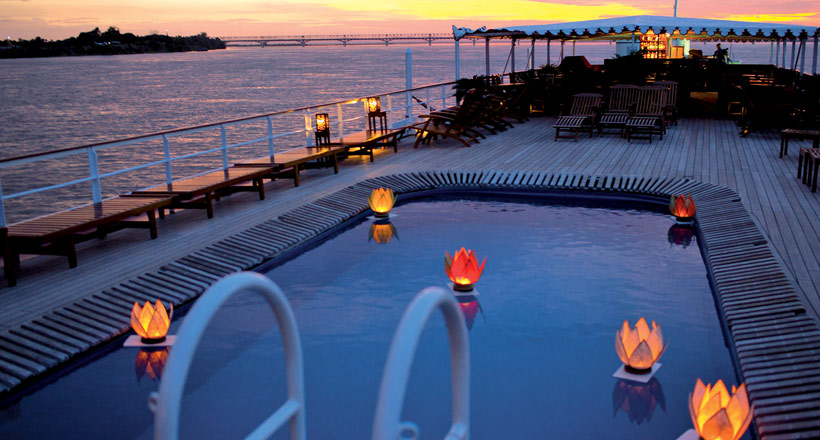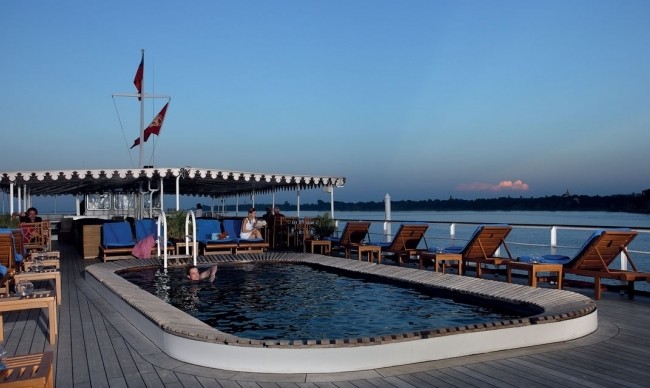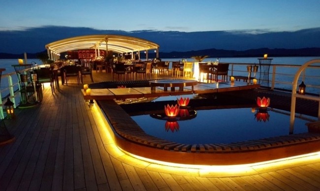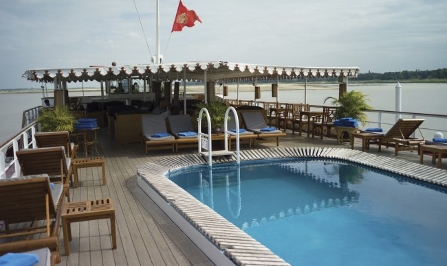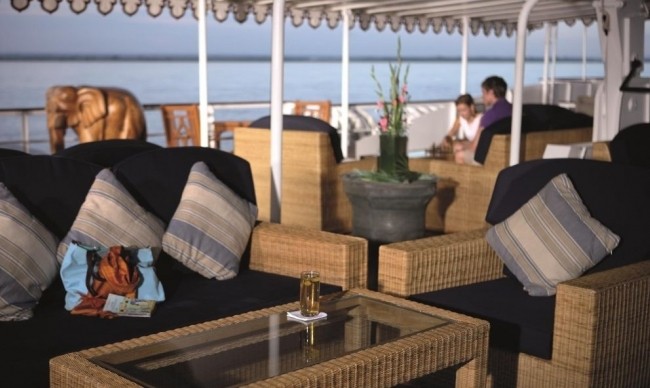 Enjoying a cocktail on the sunlight deck as the cruise streaming on the Ayeyarwady River is a very ideal thing to make.