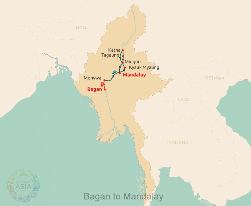 • Cruise happily along the Chindwin river to head the lands of Bagan, Pakkoku, Pakhan-Gyi, Monywa, Mingit, Kalewa, Mawlayik and Mandalay